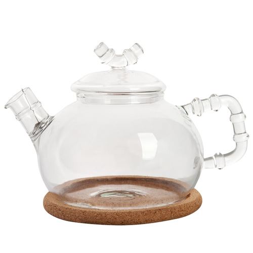 Чайник из жаропрочного стекла с пружинкой-фильтром в носике и пробковой подставкой. Объём 630 мл., дно d100 мм.