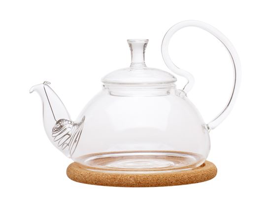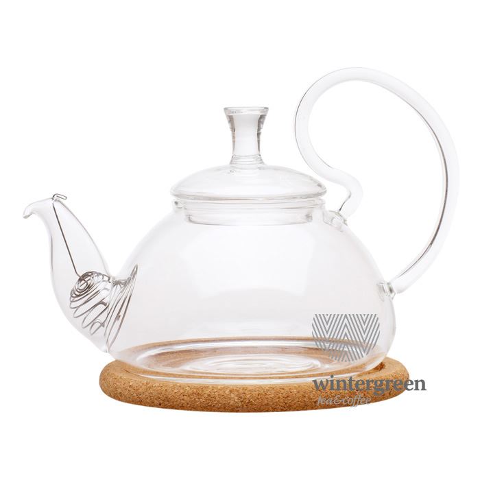 Заварочный чайник из жаропрочного стекла с пружинкой-фильтром в носике и пробковой подставкой. Объем 400 мл., дно d85 мм.