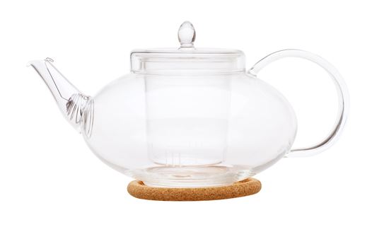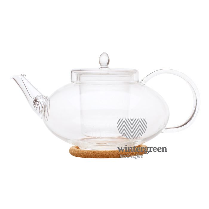 Чайник из жаропрочного стекла с заварочной колбой, пробковой подставкой и пружинкой-фильтром в носике.Объем 1л., дно d75 мм.