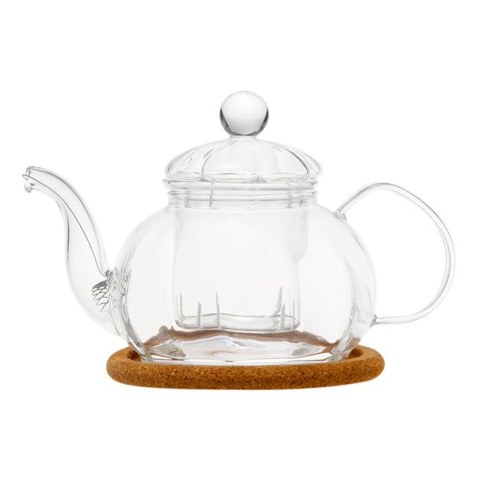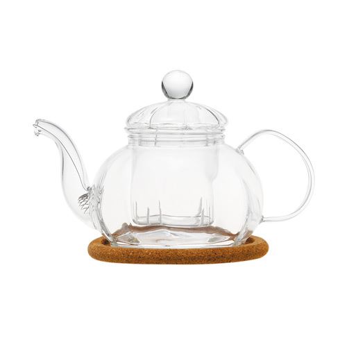 Чайник из жаропрочного стекла с заварочной колбой, пробковой подставкой и пружинкой-фильтром в носике. Объем 470 мл., дно d95 мм.