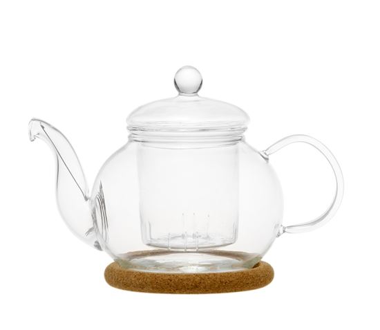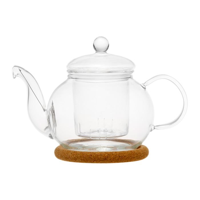 Чайник из жаропрочного стекла с заварочной колбой, пробковой подставкой и пружинкой-фильтром в носике. Объем 350 мл., дно d70 мм.